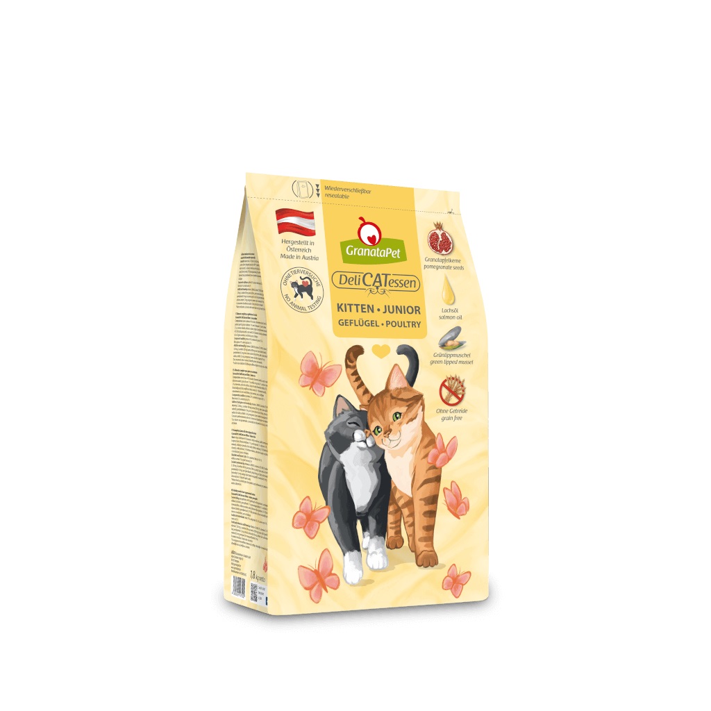 GrantaPet DeliCATessen Trockenfutter ist ein hochwertiges Alleinfuttermittel für Katzen jeder Lebensphase – ohne Getreide, mit hohem Fleischanteil, Granatapfelkernen, Lachsöl, Katzenminze und Taurin. Da Katzen von Natur aus Raubtiere und Fleischfresser sind, ist ihr Verdauungssystem auch danach ausgelegt. Getreide kann von Katzen nur schwer verdaut und kaum verwertet werden. GranataPet verzichtet daher auf Getreide in der Tiernahrung und sichert so eine optimale und an der Natur orientierte Ernährung. Das GranataPet DeliCATessen Trockenfutter wird ohne Tierversuche entwickelt und in Österreich hergestellt. Der schonende Herstellungsprozess sorgt dafür, dass wichtige Nährstoffe und Vitamine in den Zutaten erhalten bleiben. Dank der lecker duftenden Granatapfelkerne und der anregenden Katzenminze wird die DeliCATessen Mahlzeit auch von anspruchsvollen Leckermäulchen gerne verzehrt.