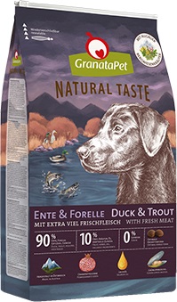 Natural Taste Ente & Forelle Trockenfutter für Hunde orientiert sich an der naturnahen und artgerechten Ernährung des Hundes. Es besteht aus 90% tierischen Zutaten (frisches Fleisch, frischer Fisch, getrocknetes Fleisch, getrockneter Fisch) und Gemüse sowie 10% Obst, Kräuter (u.a. Allgäuer Bergwiesenkräuter) und Norwegischem Lachsöl. Das frische Fleisch liefert wertvolle Proteine. Gemüse, Obst und Kräuter liefern natürliche und lebensnotwendige Vitamine und Mineralstoffe. So wird die Gesundheit und Vitalität des Hundes gefördert. Hochwertiges norwegisches Lachsöl sorgt für ein glänzendes Fell und Schutz der Haut. Die Neuseeländische Grünlippmuschel fördert gesunde Gelenke und Knochen.