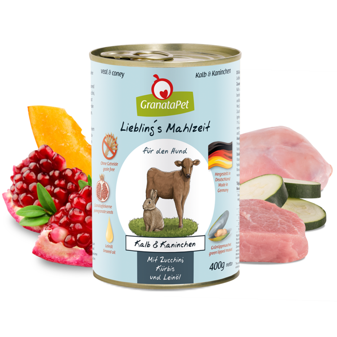 GranataPet Liebling’s Mahlzeit Kalb & Kaninchen ist mit seinem hohen Fleischanteil und der fein abgestimmten Zusammensetzung die ideale, ausgewogene Vollwertnahrung, die nur einmalig schonend dampfgegart wird, um alle wichtigen Nährstoffe zu erhalten. Durch die gezielte Zugabe von Zucchini, Kürbis und Leinöl wird dieses Hundefutter bewusst verfeinert und schafft es, ausschließlich mit gesunden und leckeren Zutaten jedes Hundeherz zu erobern.