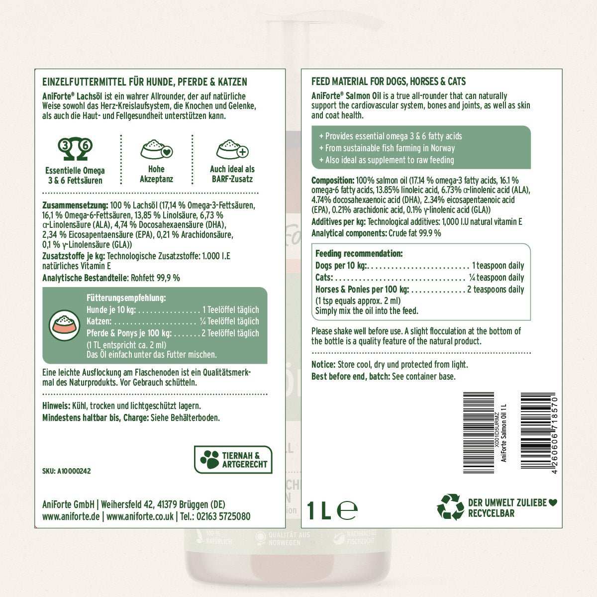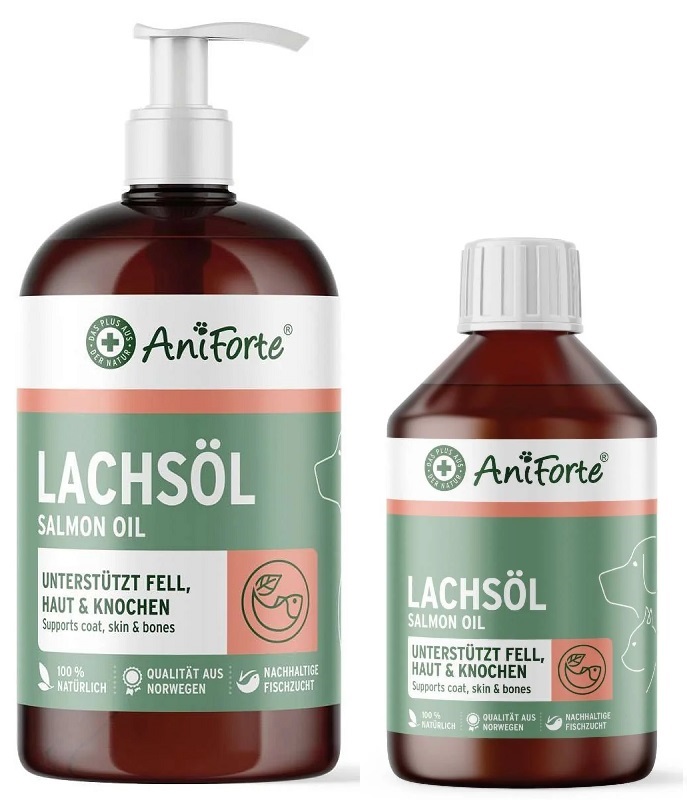 AniForte® Lachsöl für Hund, Katze und Pferd ist eine rein natürliche Ergänzung der täglichen Ernährung deines Tieres. Du kannst das Öl ganz einfach bei der normalen Fütterung oder auch beim Barfen dazugeben. Die im Lachsöl enthaltenen essenziellen Fettsäuren tragen dazu bei, dass Hund, Katze und Pferd optimal bei der Haut- und Fellgesundheit unterstützt werden.