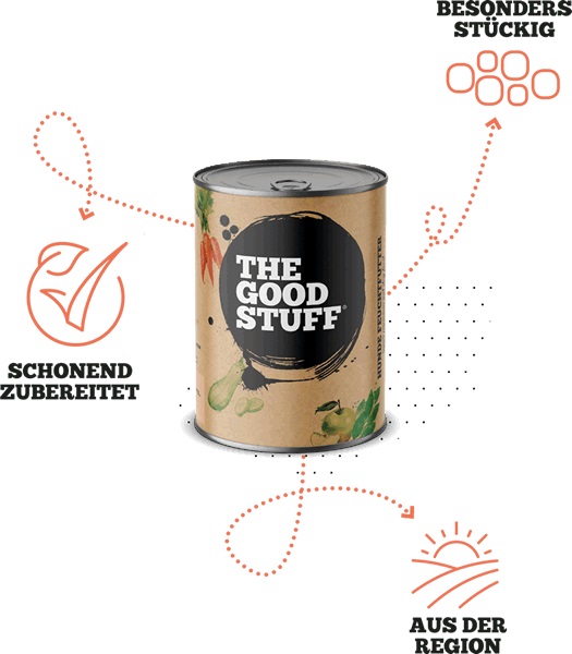 Für das Nassfutter von THE GOODSTUFF werden ausschließlich beste natürliche Zutaten möglichst aus der Region verwendet. Frisches Fleisch und knackiges Gemüse werden schonend gegart und gemeinsam mit Kräutern und Obst zu wohlschmeckenden Menüs verarbeitet. Es wird besonders darauf geachtet, Fleisch, Obst und Gemüse besonders stückig zu verarbeiten - das lieben auch die größten Feinschmecker!